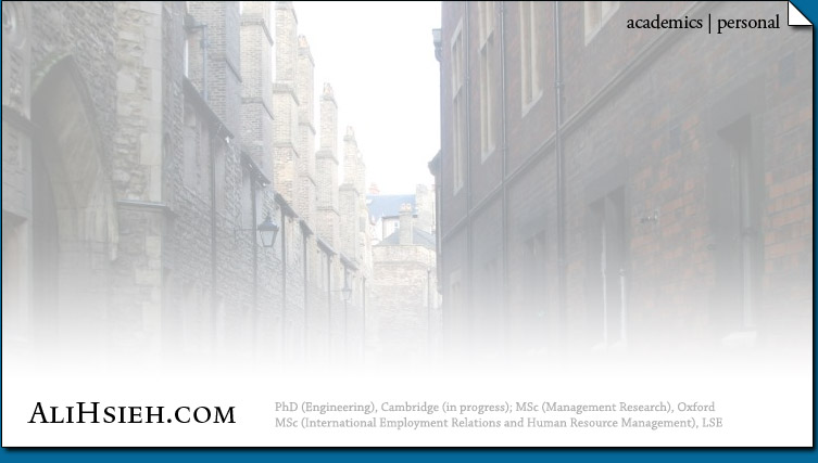 My name is ALI Ying-Che Hsieh. Welcome to my academic personal website. I am originally from Taipei, Taiwan. I am now a doctoral student in University of Cambridge (IfM). My current research is to look at the Human Resource Management in Chinese Entrepreneurial Firms.